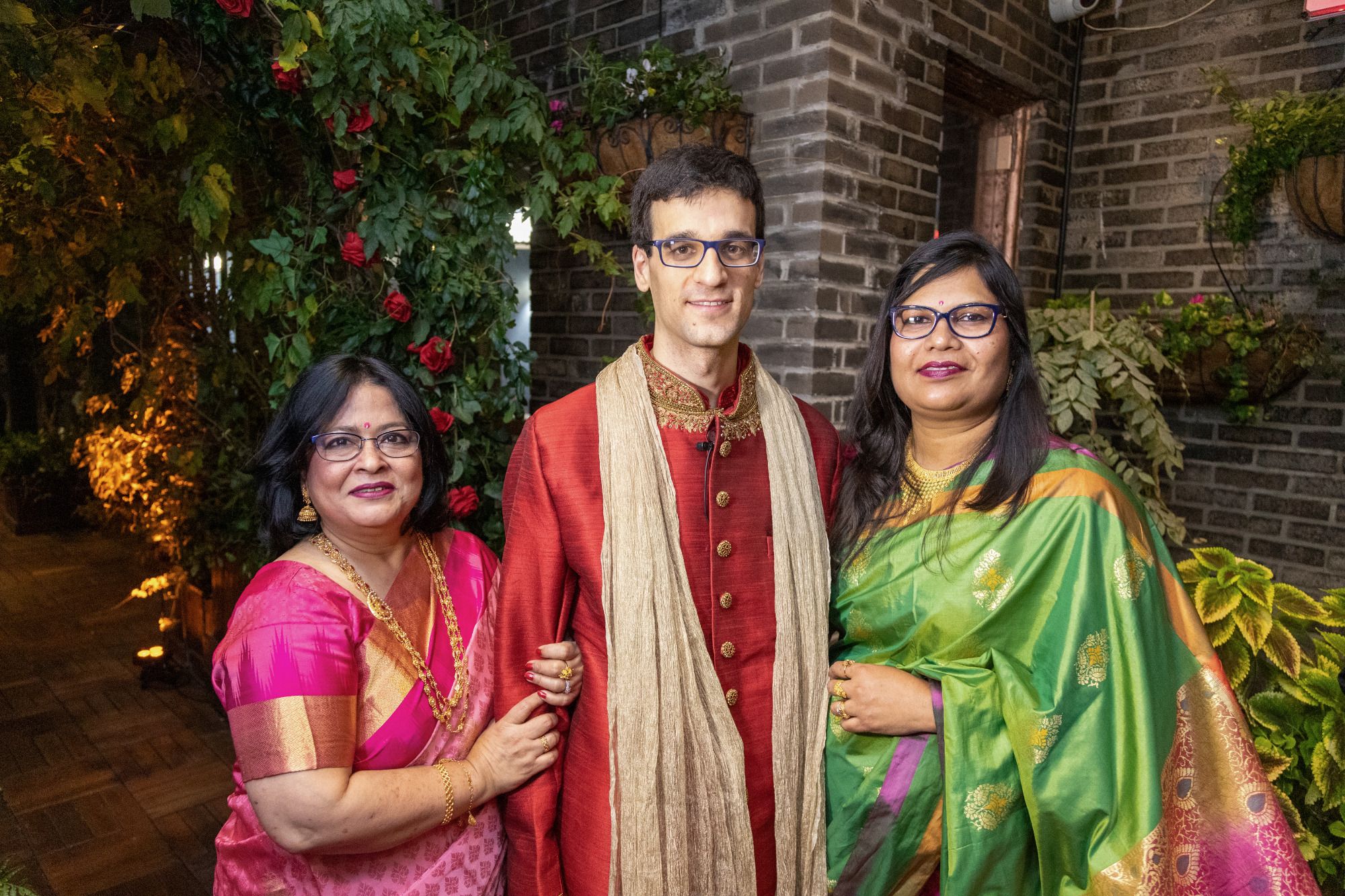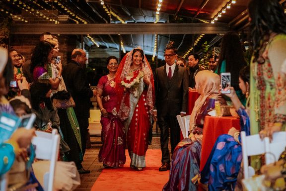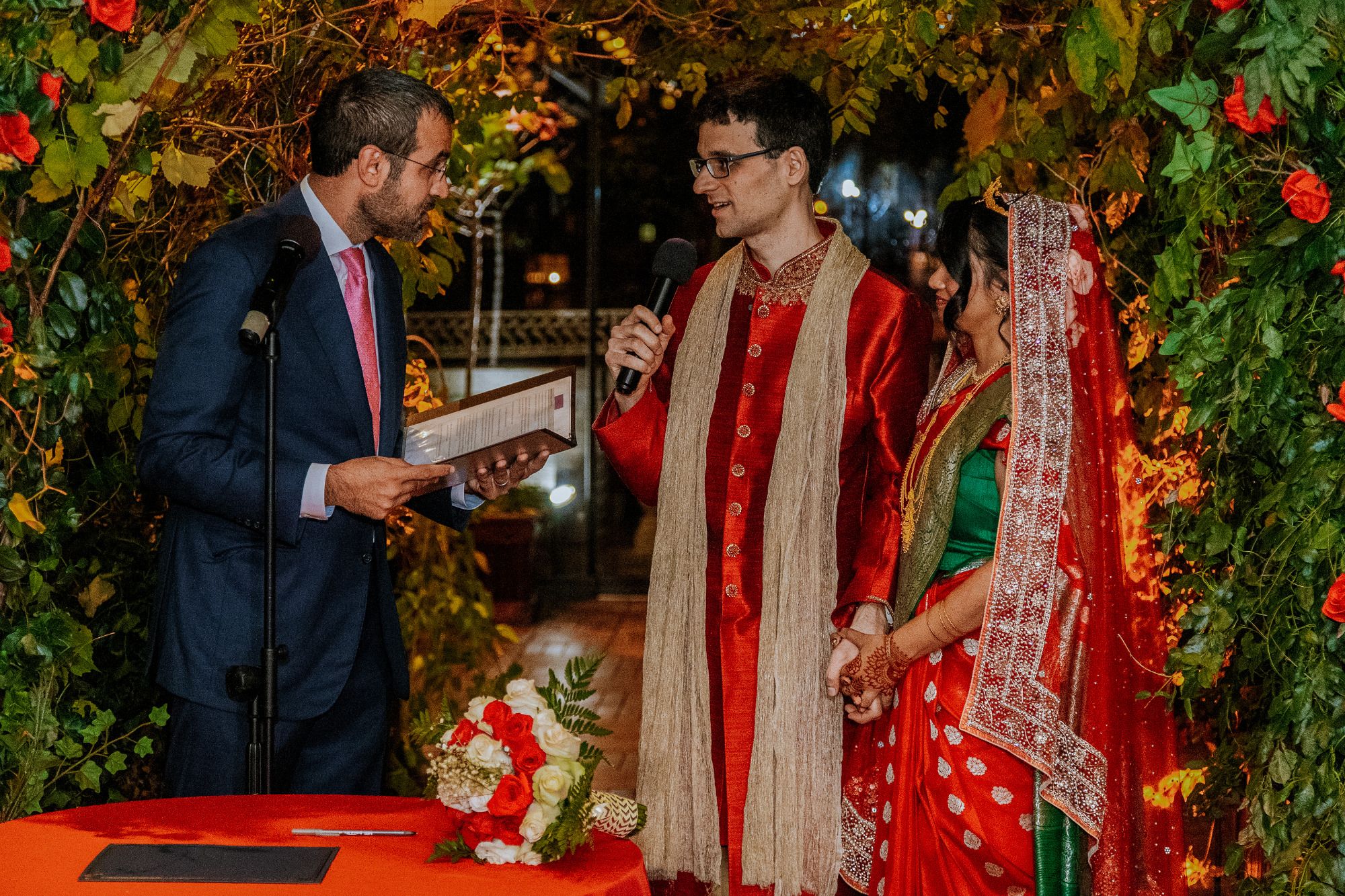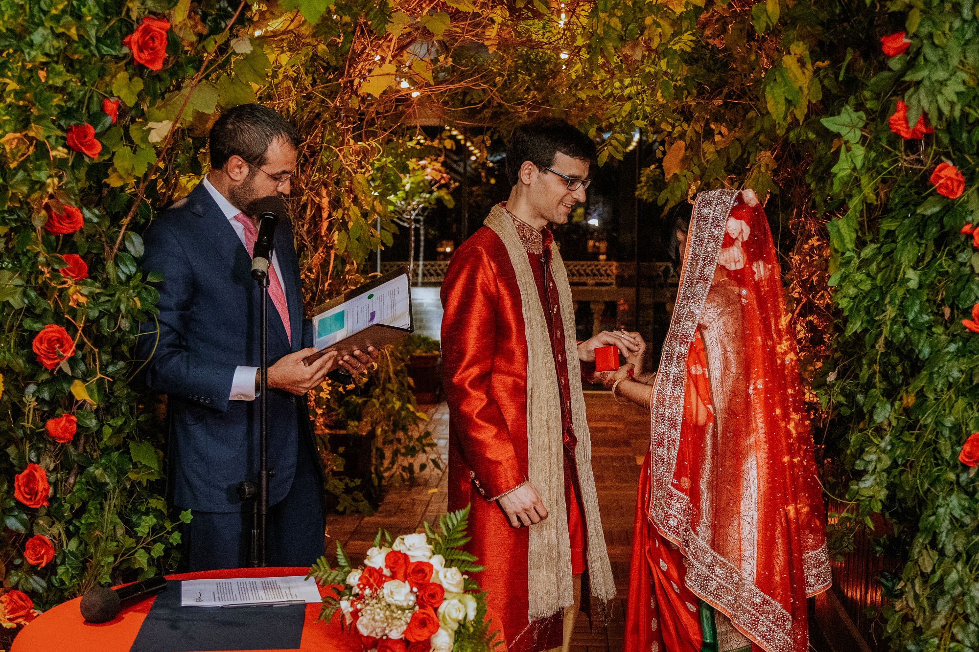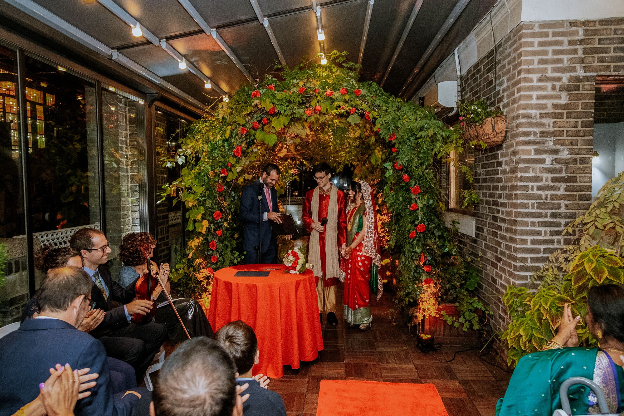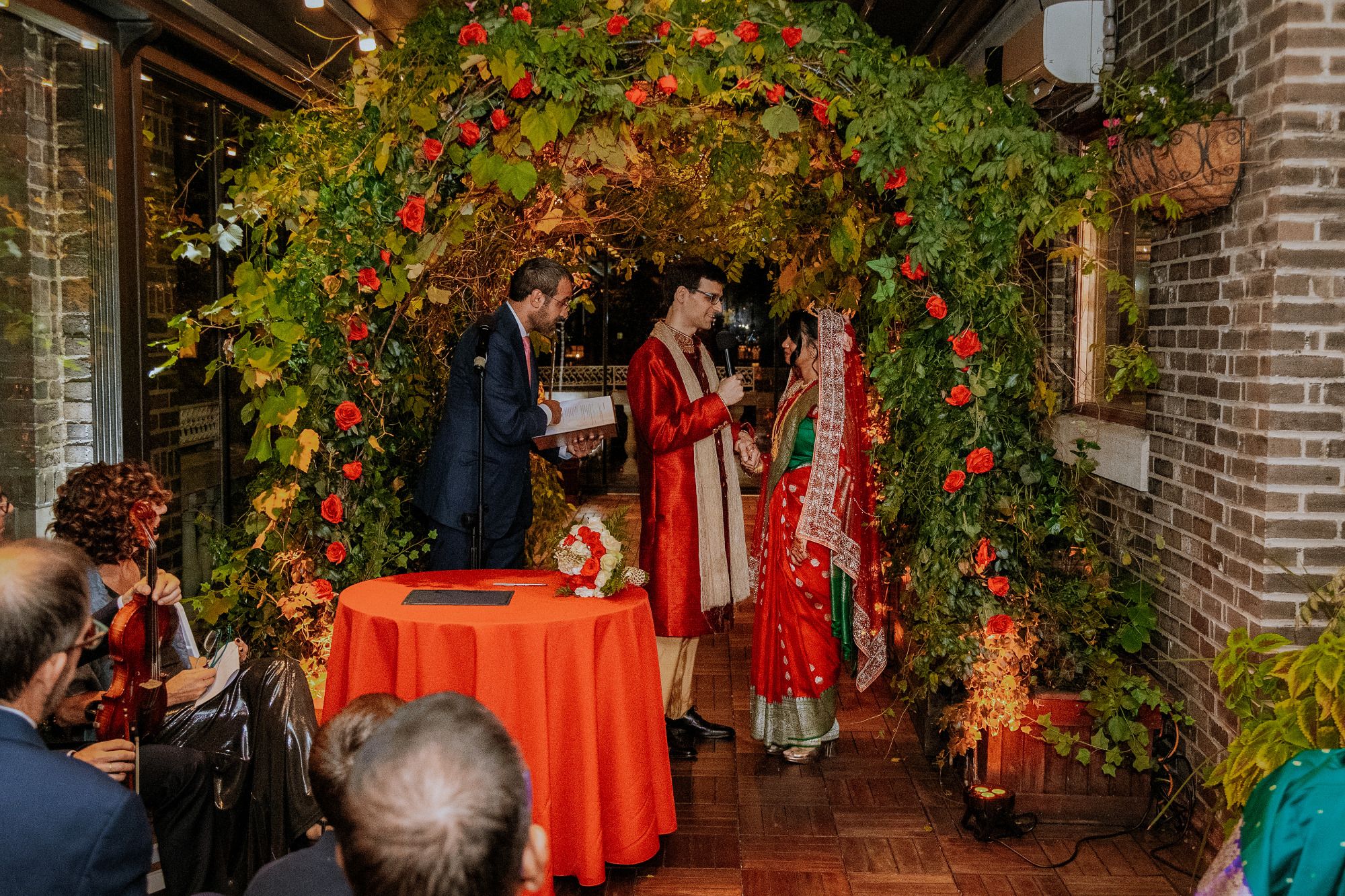 There were so many details that made this ceremony special-- Sylvia walked down the aisle in the same red wedding sari her mother wore decades ago, to a beautiful violin solo by Albert's brother, Oriol, and holding a bouquet of roses handmade by Sylvia's aunt, Mimi. Albert's mother and sister-in-law, Berta, did a beautiful poetry recitation accompanied by violin, and our officiant incorporated bits of all the many cultures and languages represented on the rooftop that night