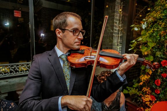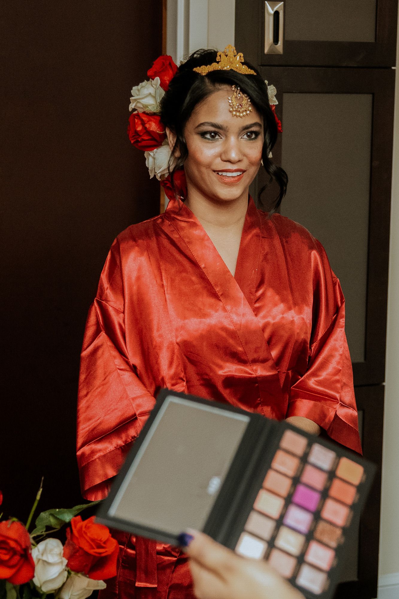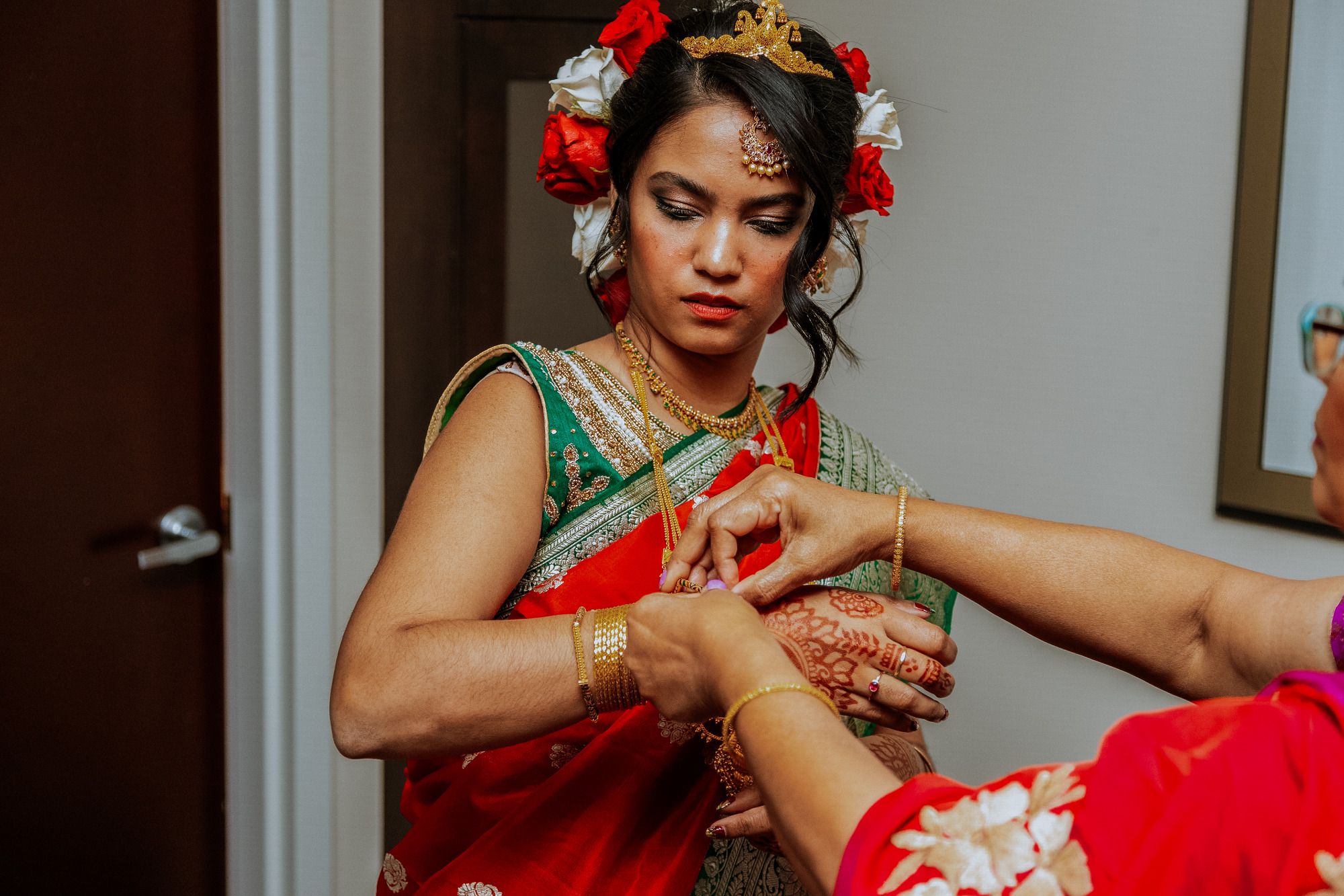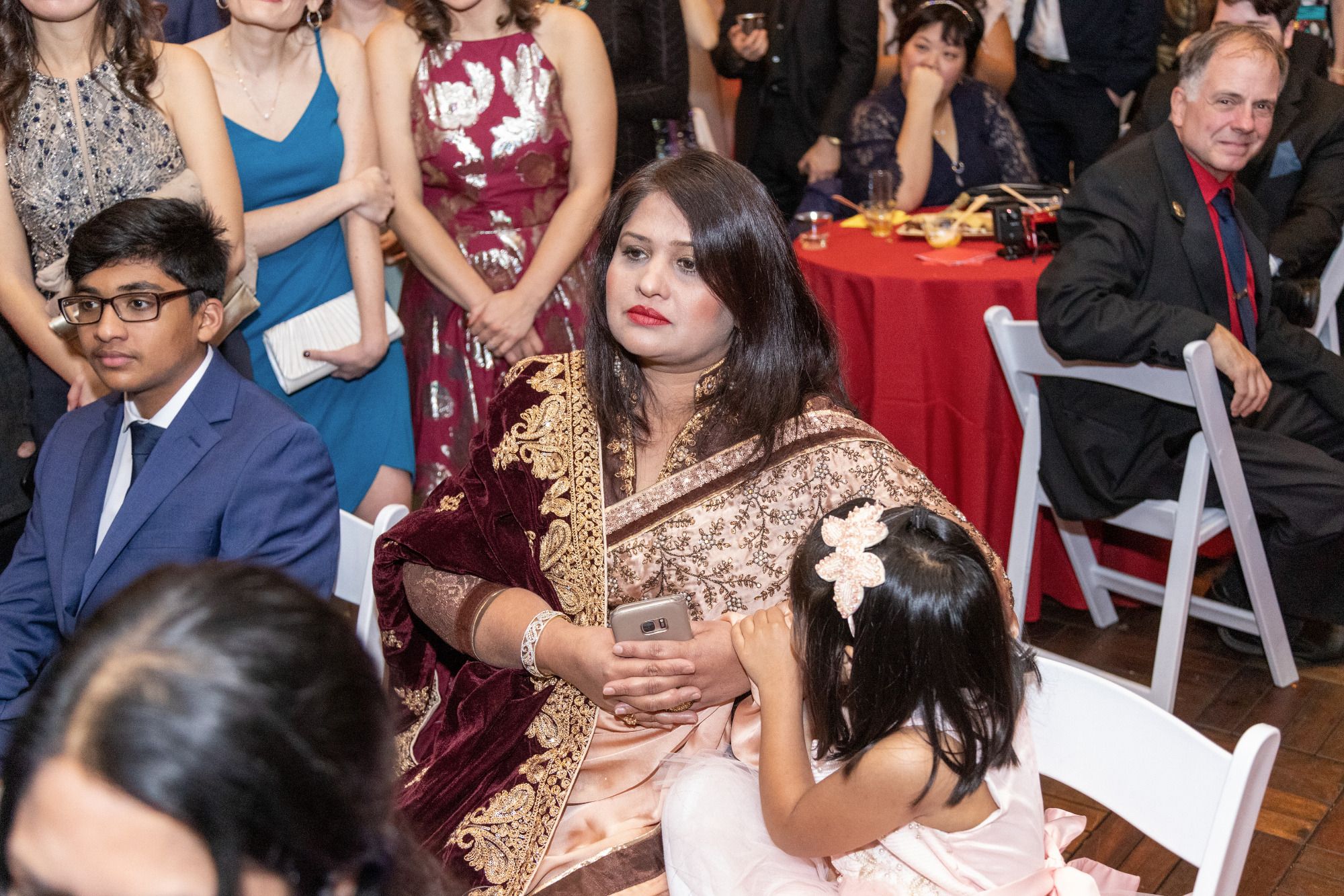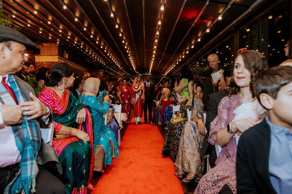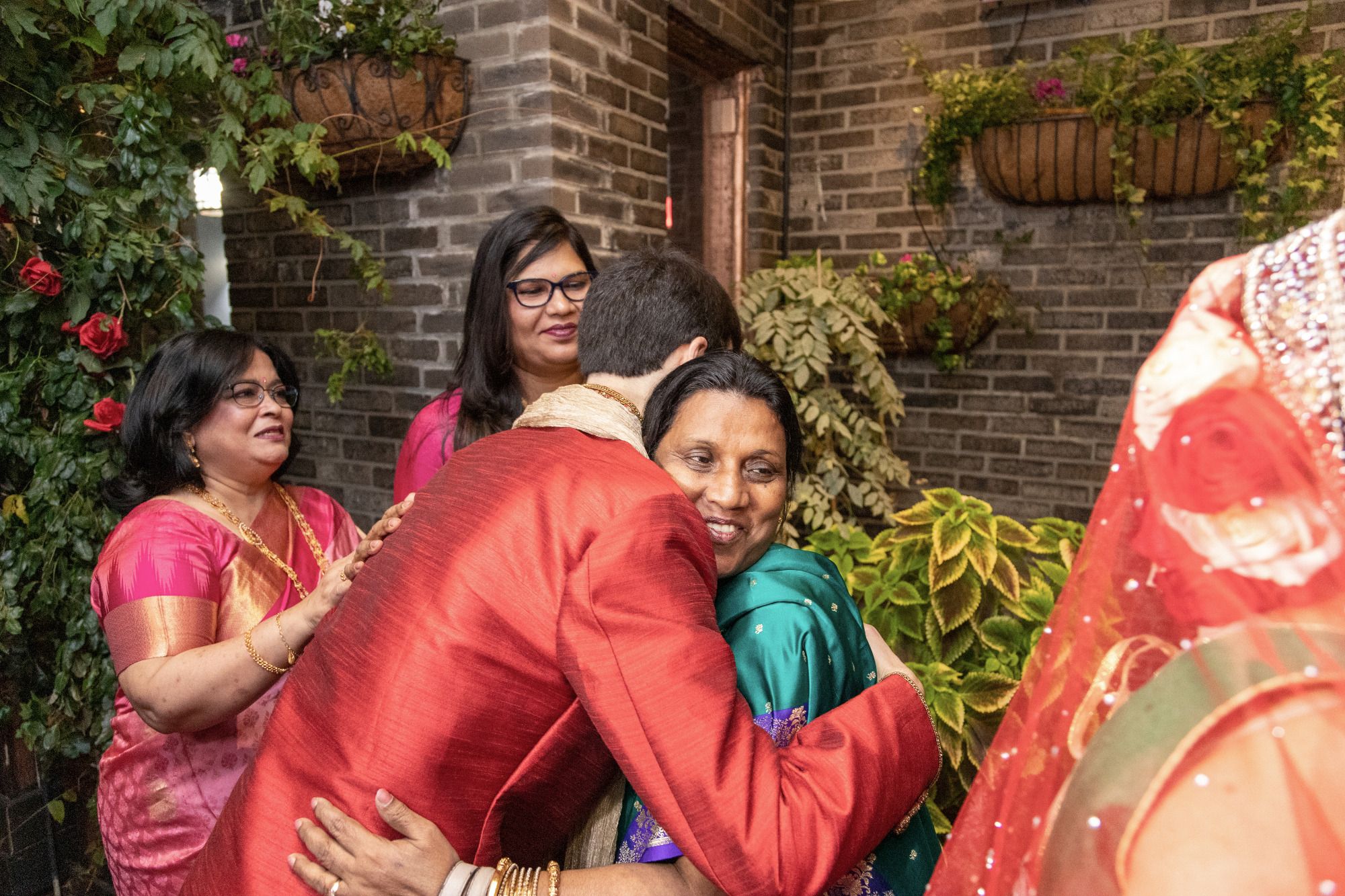 There were so many details that made this ceremony special-- Sylvia walked down the aisle in the same red wedding sari her mother wore decades ago, to a beautiful violin solo by Albert's brother, Oriol, and holding a bouquet of roses handmade by Sylvia's aunt, Mimi. Albert's mother and sister-in-law, Berta, did a beautiful poetry recitation accompanied by violin, and our officiant incorporated bits of all the many cultures and languages represented on the rooftop that night